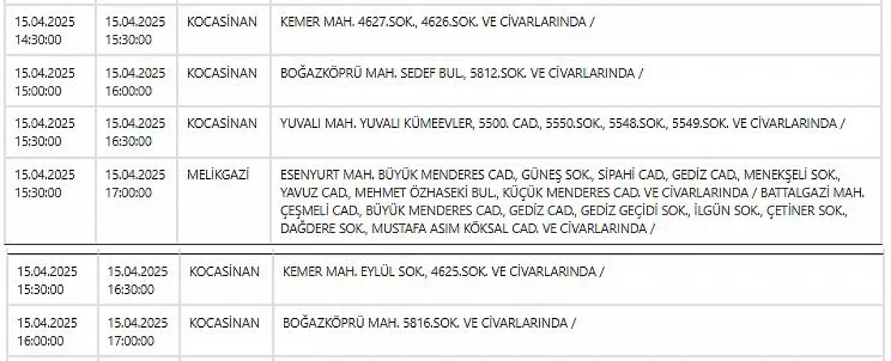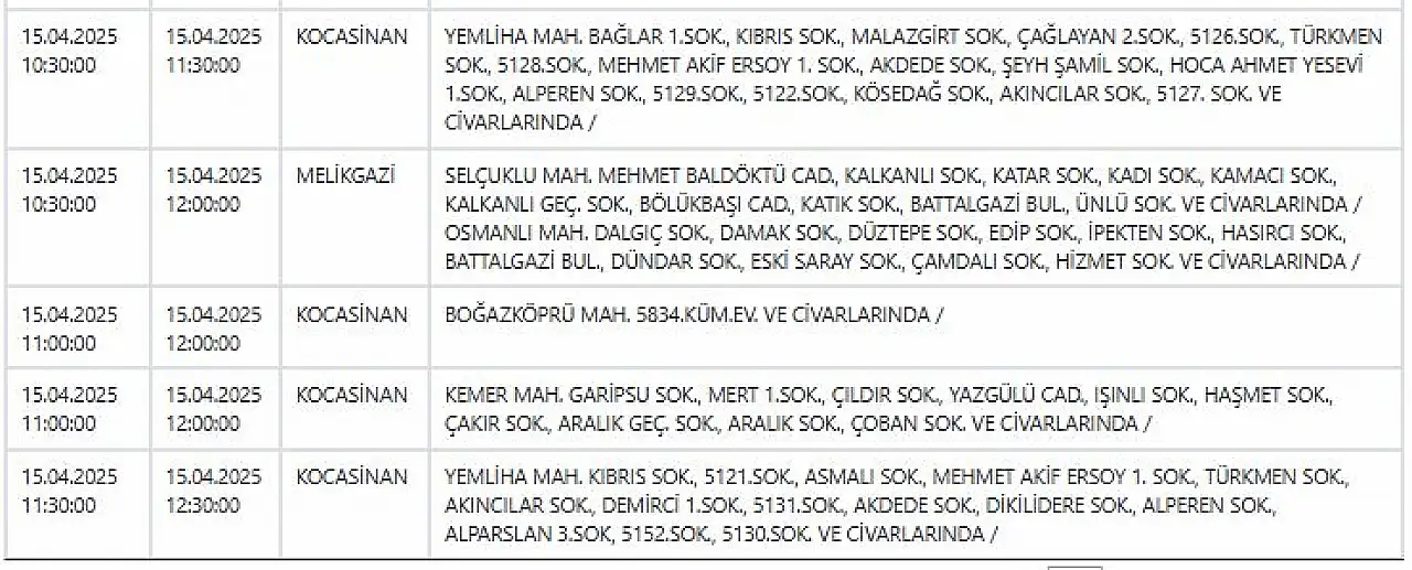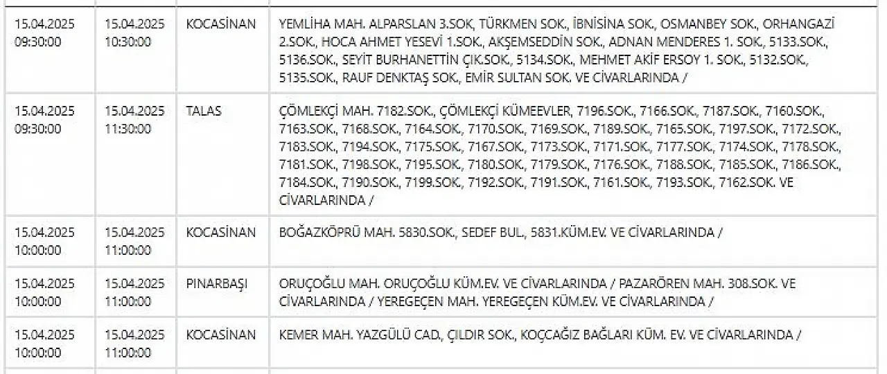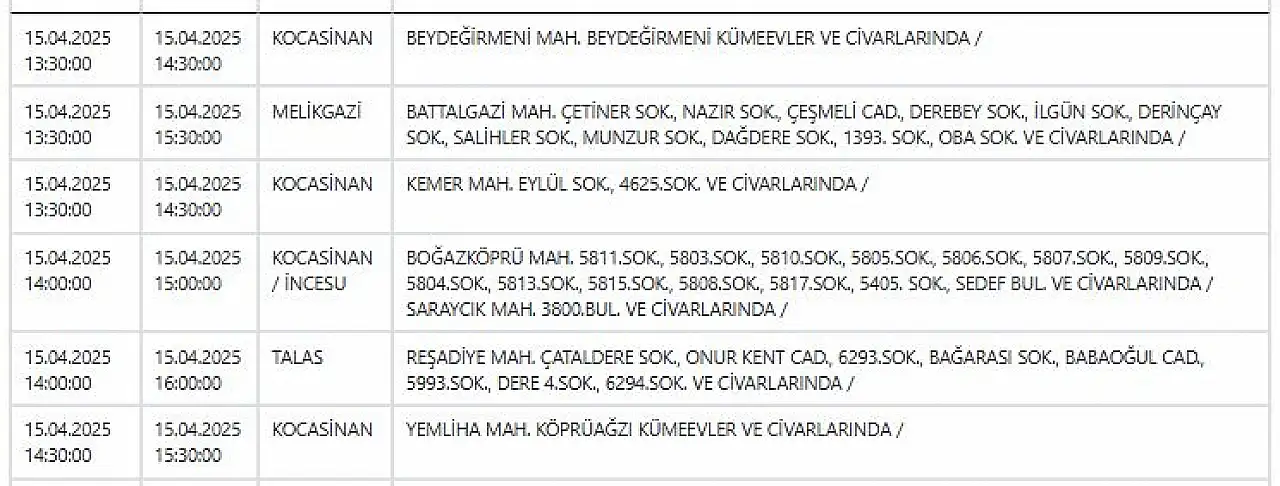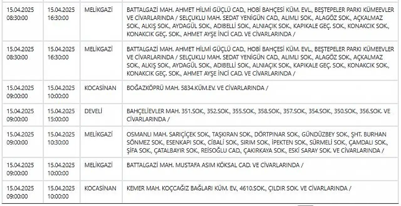 Elektrik kesintilerinin yaşanacağı ilçeler arasında Kayseri’nin Melikgazi, Kocasinan, Tomarza, Yahyalı gibi en merkezi ve yoğun nüfuslu bölgeleri de yer alıyor.