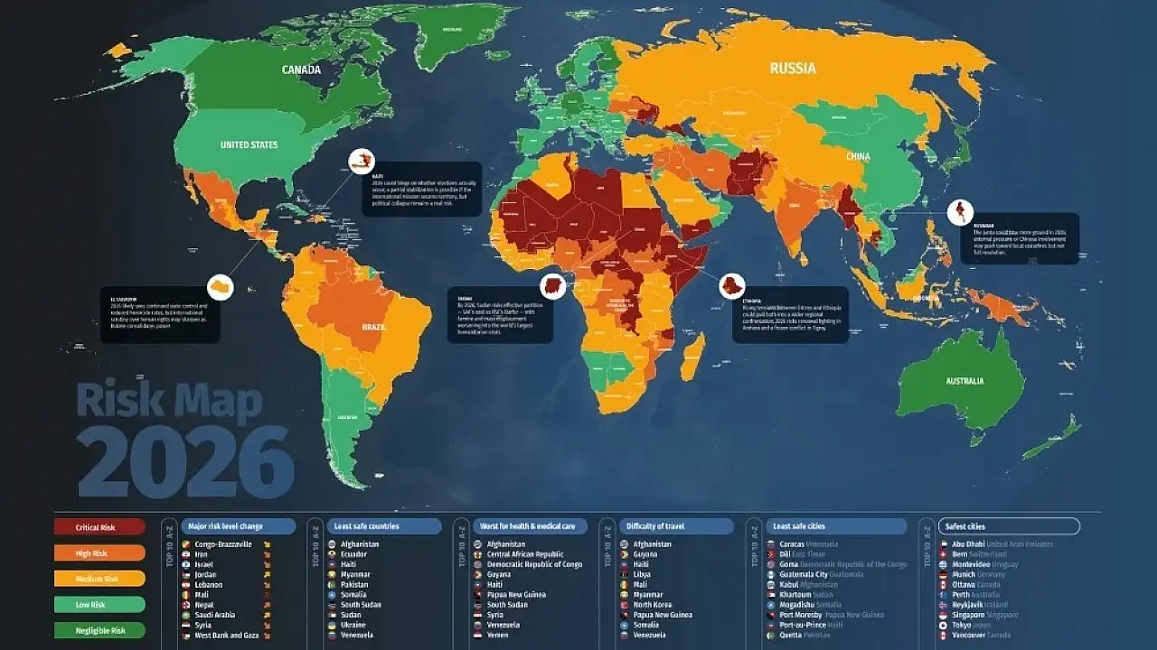 Seyahat güvenliği şirketleri 2026 yılı risk haritasını yayımladı. Analistlere göre Afganistan, Myanmar, Pakistan, Sudan, Güney Sudan, Ukrayna, Haiti, Venezuela, Ekvador ve Somali en tehlikeli ülkeler arasında yer alıyor. İşte tam liste…
