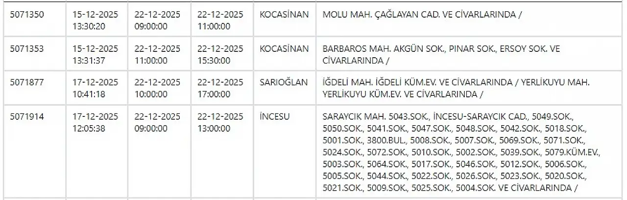 KCETAŞ’tan edinilen bilgilere göre yarın (22 Aralık 2025) aşağıdaki mahallelerde elektrik kesintisi yaşanacak.