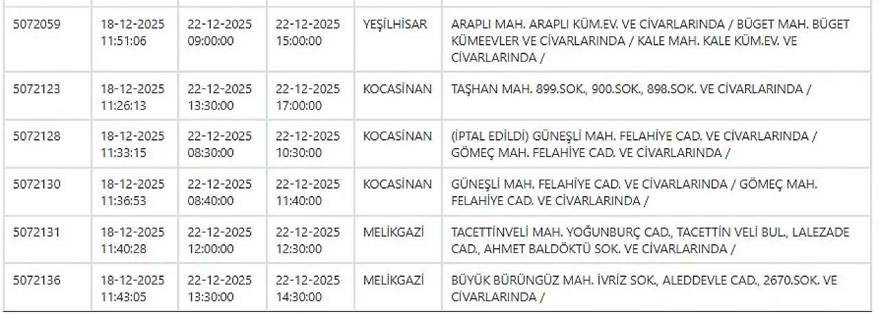Kayseri'nin çeşitli ilçelerinde elektrik kesintisi yaşanacağı duyuruldu. Vatandaşlar hangi bölgelerde elektriklerin kesileceğini araştırıyor. İşte 22 Aralık 2025 Pazartesi Kayseri elektrik kesintisi sorgulama...