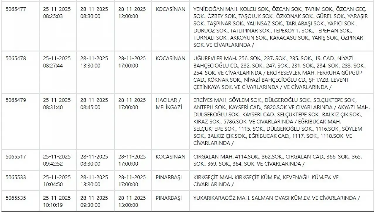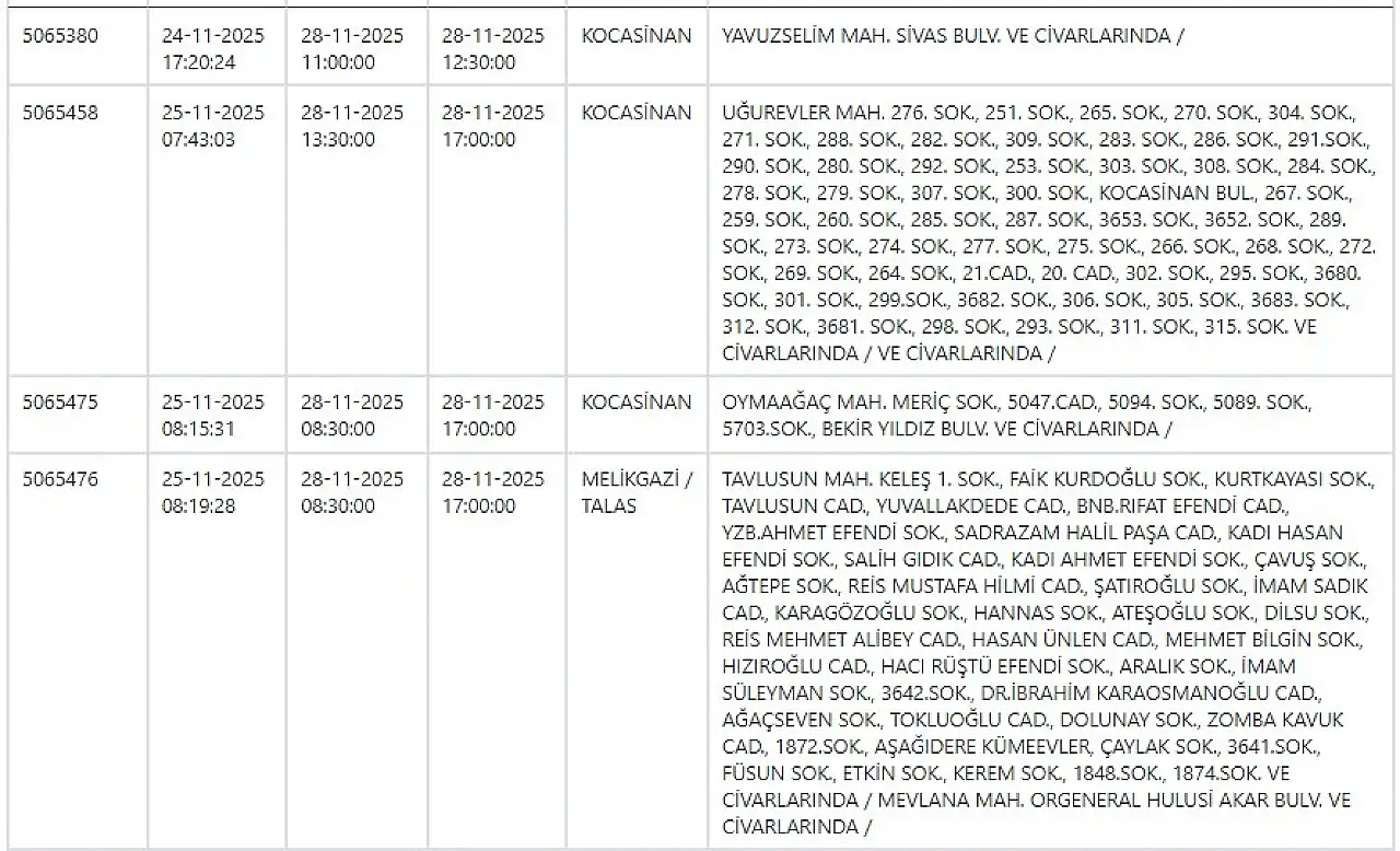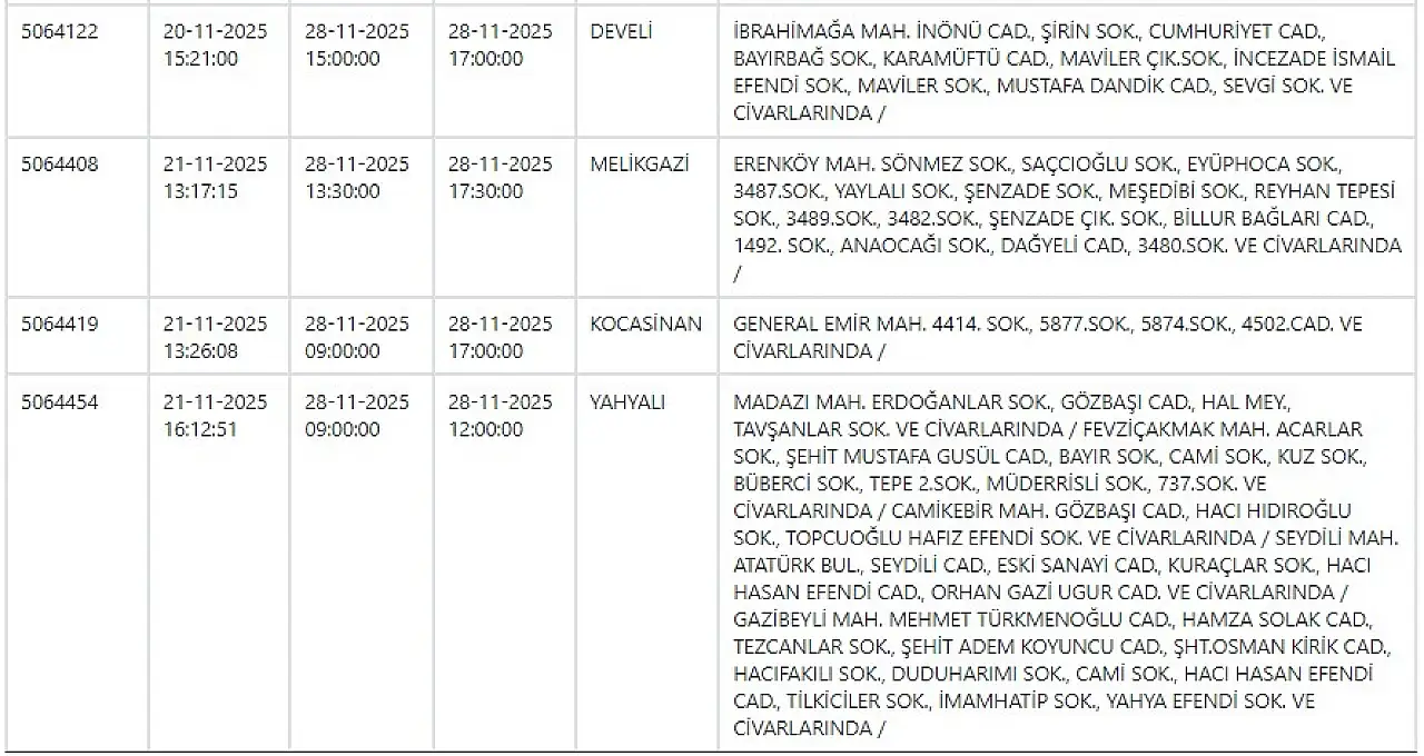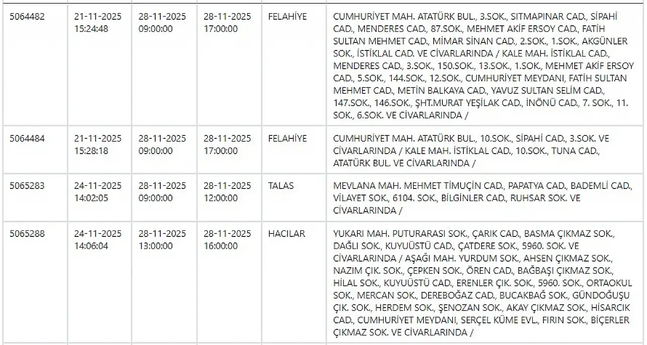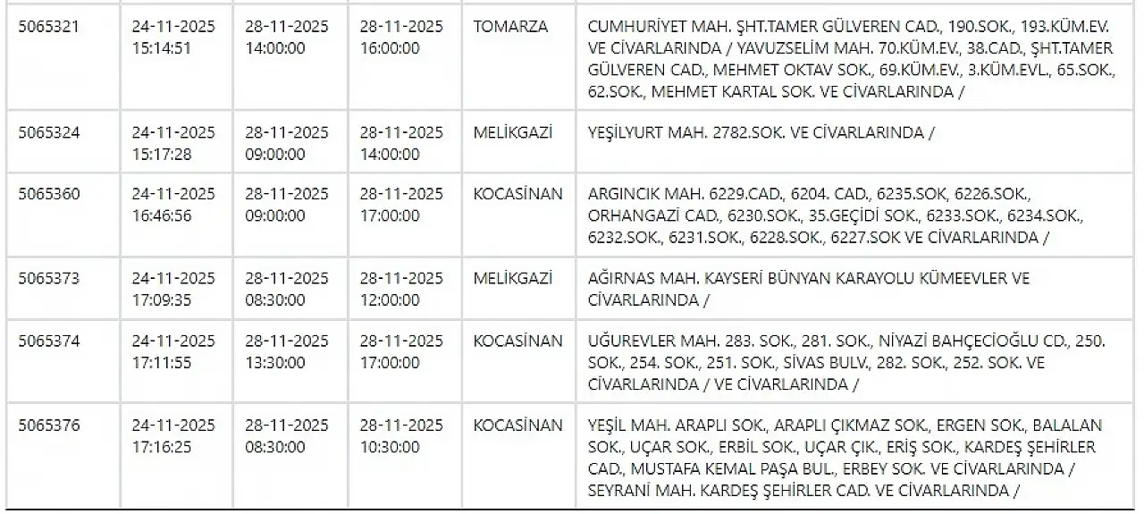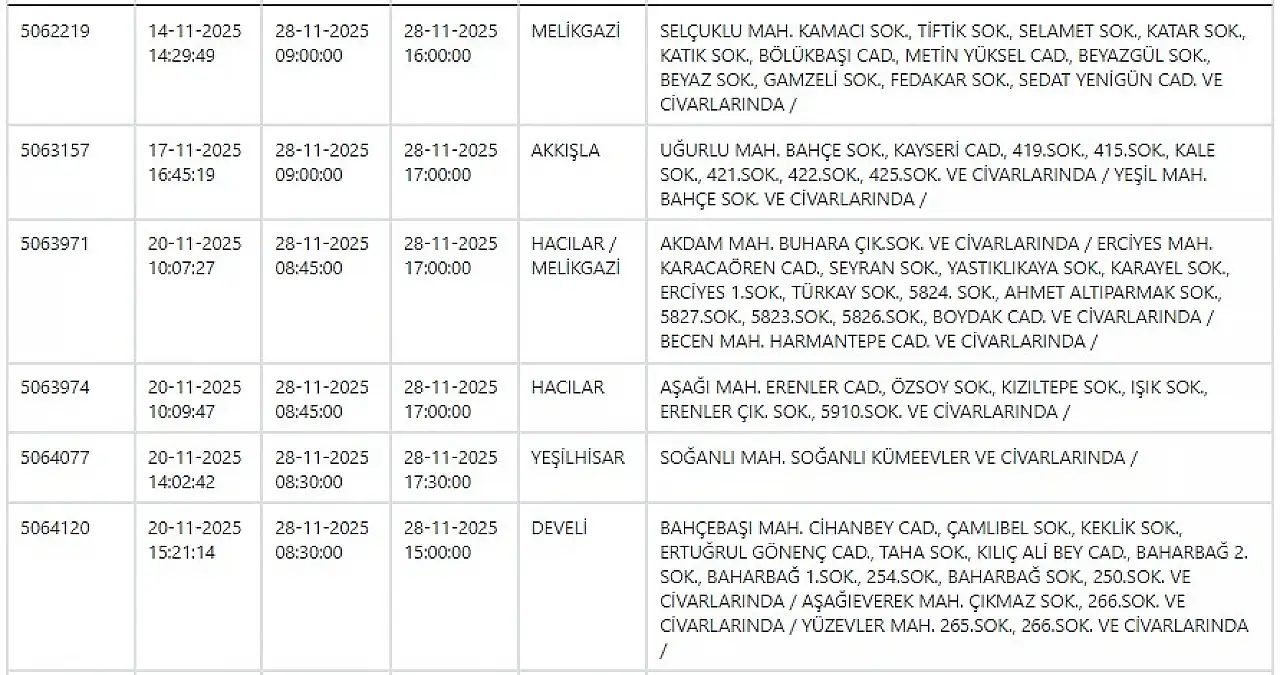 28 Kasım 2025 Kayseri için güncel elektrik kesintisi listesi!