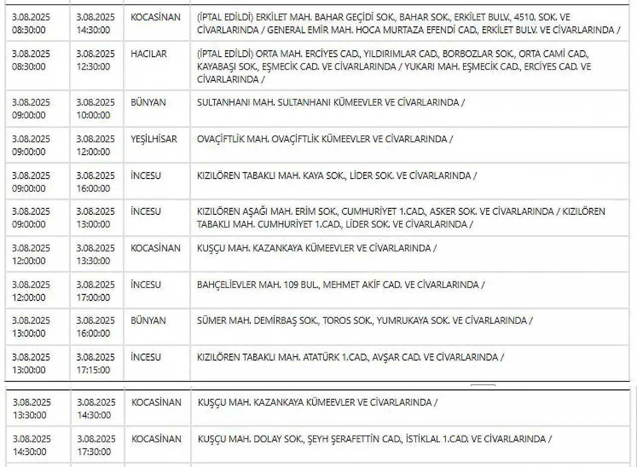 KCETAŞ’tan edinilen bilgilere göre yarın (3 Ağustos 2025) aşağıdaki mahallelerde elektrik kesintisi yaşanacak.