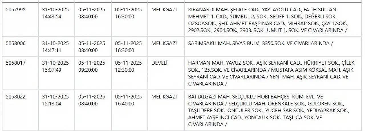 5 Kasım Kayseri elektrik kesinti listesi belli oldu!