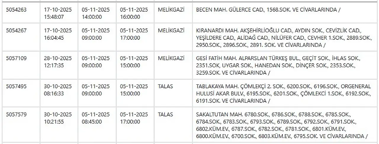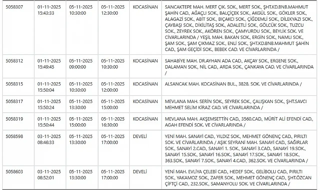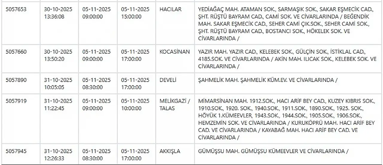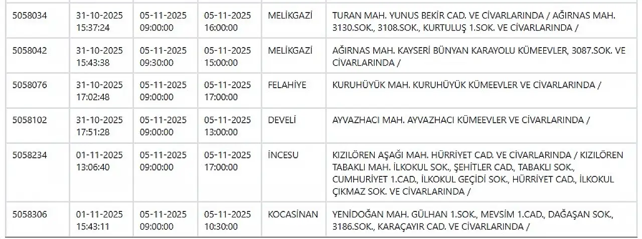 KCETAŞ’tan edinilen bilgilere göre 5 Kasım 2025 tarihinde aşağıdaki mahallelerde elektrik kesintisi yaşanacak.
