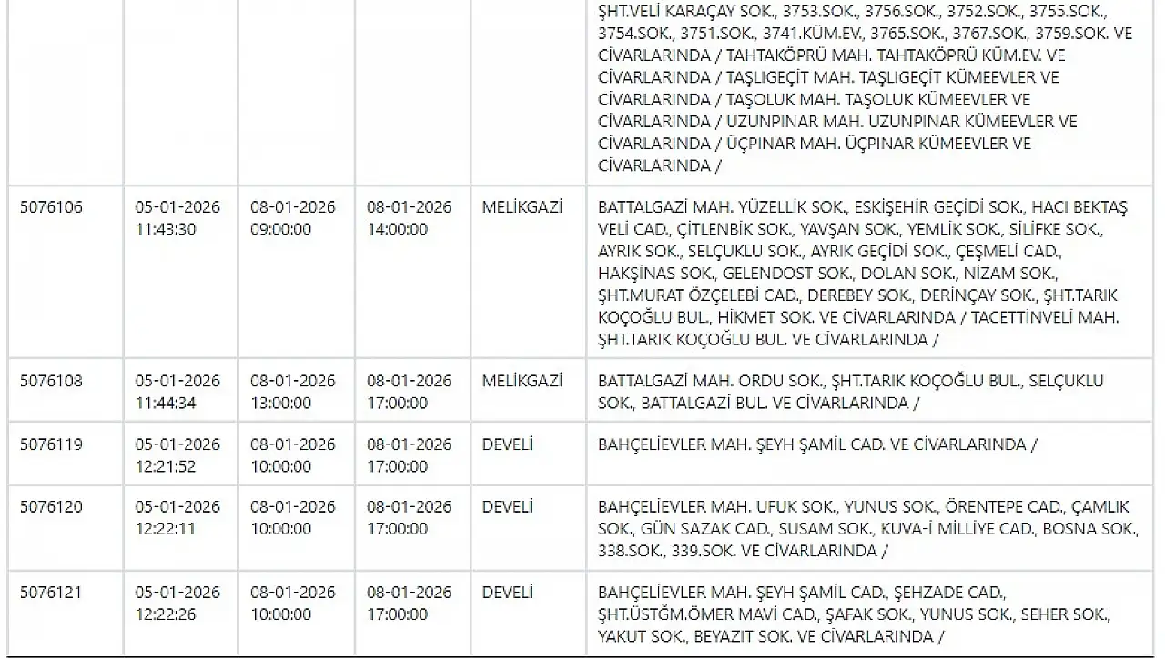KCETAŞ’tan edinilen bilgilere göre yarın (8 Ocak 2026) aşağıdaki mahallelerde elektrik kesintisi yaşanacak.