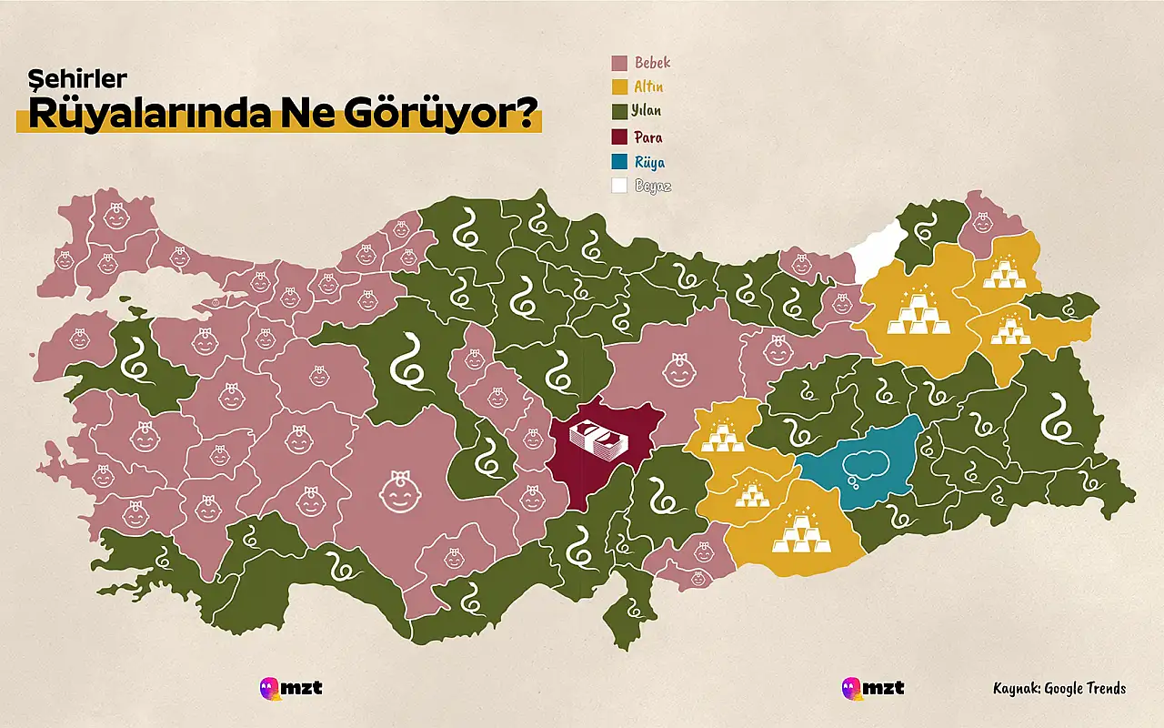 MZT’nin sosyal medya hesabında Google Trends kaynaklı ilginç bir istatistik paylaşıldı. Paylaşımda ‘Şehirler Rüyalarında Ne Görüyor’ başlığıyla hangi şehrin çoğunlukla hangi rüyayı gördüğü belirlendi. Bu verilere ise, Google’da yapılan rüya tabirleri aramaları sonrası ulaşıldı.