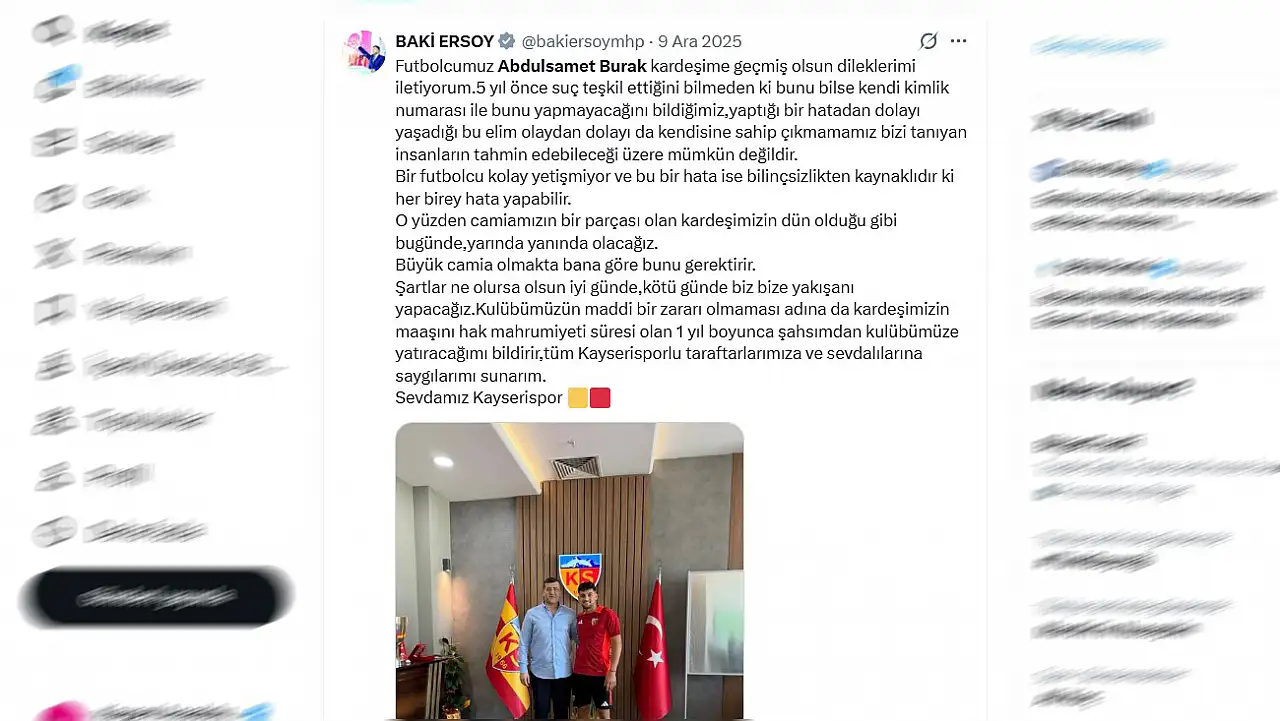 MHP Kayseri Milletvekili Baki Ersoy, sosyal medya hesabı üzerinden yaptığı paylaşımla, bahis soruşturması kapsamında 1 yıl hak mahrumiyeti cezası alan Kayserisporlu Abdulsamet Burak'a destek mesajı yayımlamış ve futbolcunun maaşını şahsi hesabından ödeyeceğini duyurmuştu.