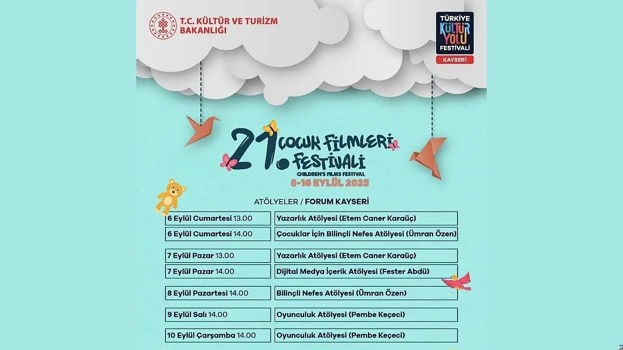 Kültür ve Turizm Bakanlığı tarafından Türkiye Kültür Yolu Festivali kapsamına alınan 21. Çocuk Filmleri Festivali, 6-16 Eylül 2025 tarihleri arasında Kayseri’de gerçekleştirilecek. Forum Kayseri’de düzenlenecek atölyeler ve özel etkinliklerle miniklere unutulmaz anlar yaşatılacak.