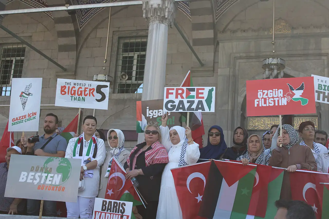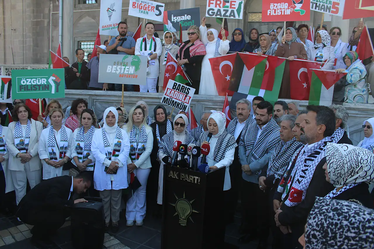 ‘’Bizler İstanbul’dan, Hakkari’den, Trabzon’dan, Erzurum’dan ve Türkiye’nin 81 ilinden dünyanın dört bir yanındaki kadınlara, kız kardeşlerimize sesleniyoruz: Barış kadınla mümkün. Barışçıl bir şekilde yola çıkan ve uluslararası sularda haydut İsrail’in hukuksuz müdahalesine uğrayan Küresel Sumud Filosu’nu dünya öylece seyretti. Hamdolsun Türkiye; Cumhurbaşkanımız Recep Tayyip Erdoğan’ın kararlılığıyla bu adaletsizlik karşısında da sessiz kalmadı. Sadece kendi ülkesinin vatandaşlarını değil, 13 ülkeden 101 vicdan sahibi gönüllünün de ülkelerine güvenle dönmelerini sağladı. Bizler de ablukayı delmek ve insanlık onurunu korumak için mücadele eden kahramanların ülkemize dönüşlerinde oradaydık. Hepsinin dilinde aynı temenni vardı; 'Biz elimizden geleni yaptık, umarım Gazze’ye bir umut ışığı olabilmişizdir'. İşte bugün o umut sözleri de bu meydanda yankılanıyor. Biz bugün bütün kimliklerimizden sıyrılarak; sadece kadın kimliğimizle buradayız. Çünkü bu mesele ne dünyadaki rollerimizle, ne taşıdığımız unvanlarla, ne de sahip olduklarımızla ilgilidir, bu mesele insanlık meselesidir. Bugün Türkiye’den tüm dünyaya tek bir şey söylüyoruz; barış kadınla mümkündür’‘ diye konuştu.