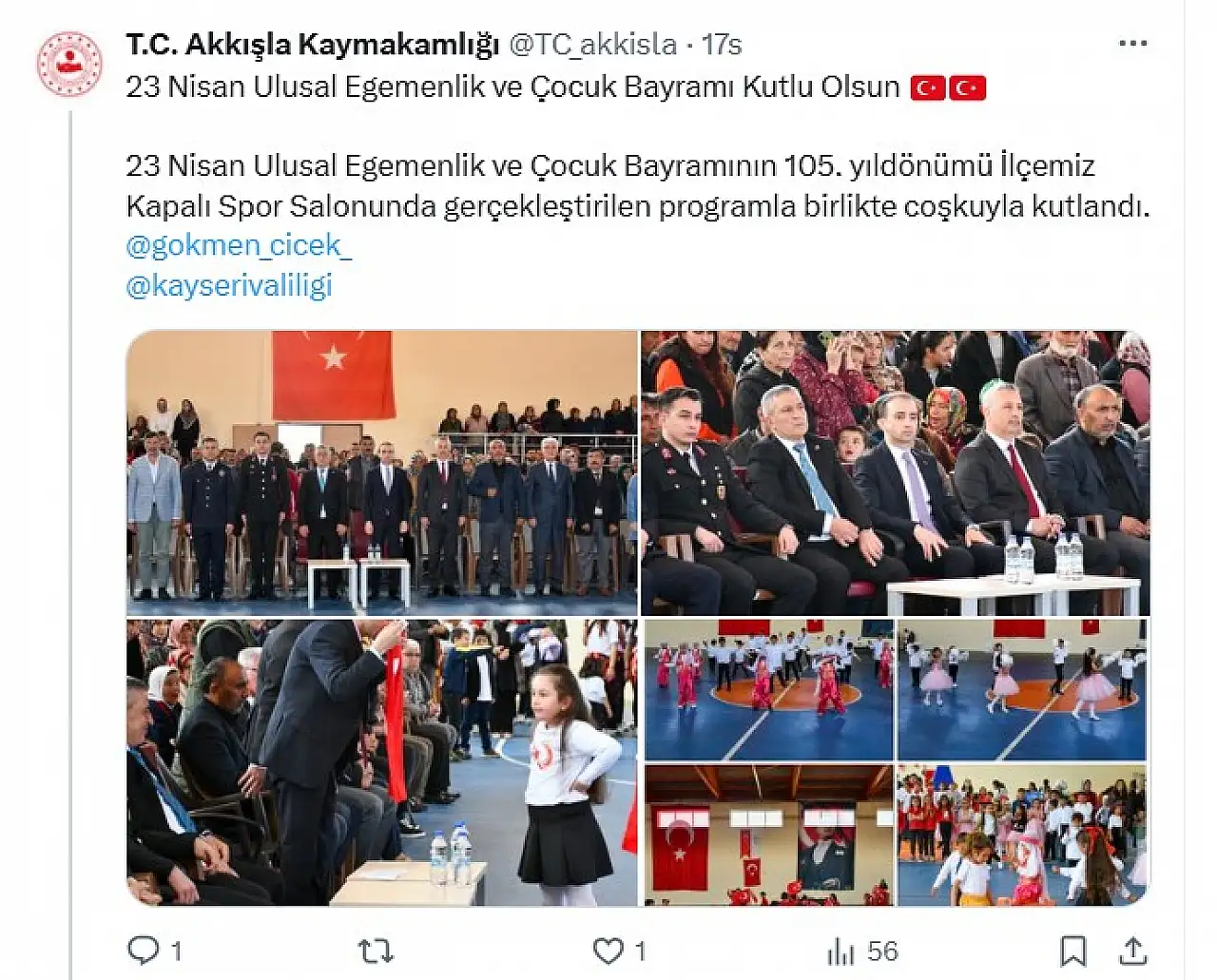 Kayseri'nin tarımsal üretim açısından önemli ilçeleri arasında yer alan Akkışla'da da diğer tüm ilçelerde olduğu gibi 23 Nisan Ulusal Egemenlik ve Çocuk Bayramı coşkusu yaşandı. Akkışla Kapalı Spor Salonu'nda gerçekleşen etkinliklere ilçe protokolü ve vatandaşlar katıldı. Öğrencilerin sergilediği gösteriler büyük beğeni topladı.