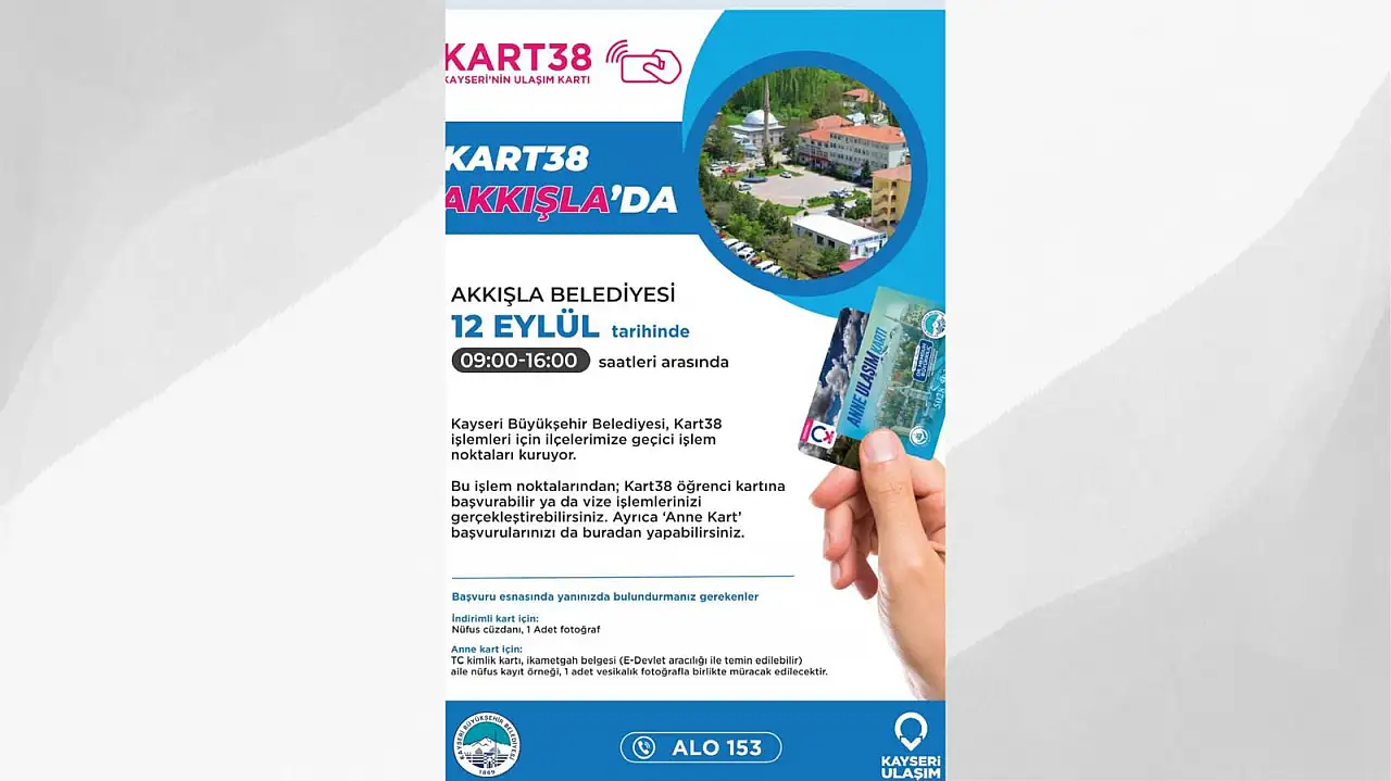 Kayseri Ulaşım A.Ş. tarafından yapılan paylaşıma göre 12 Eylül 2025 Cuma günü kurulacak işlem noktasında vatandaşlar ulaşım kartlarını çıkartabilecek. İşlem noktası saat 09:00 ile 16:00 arasında hizmet verecek.