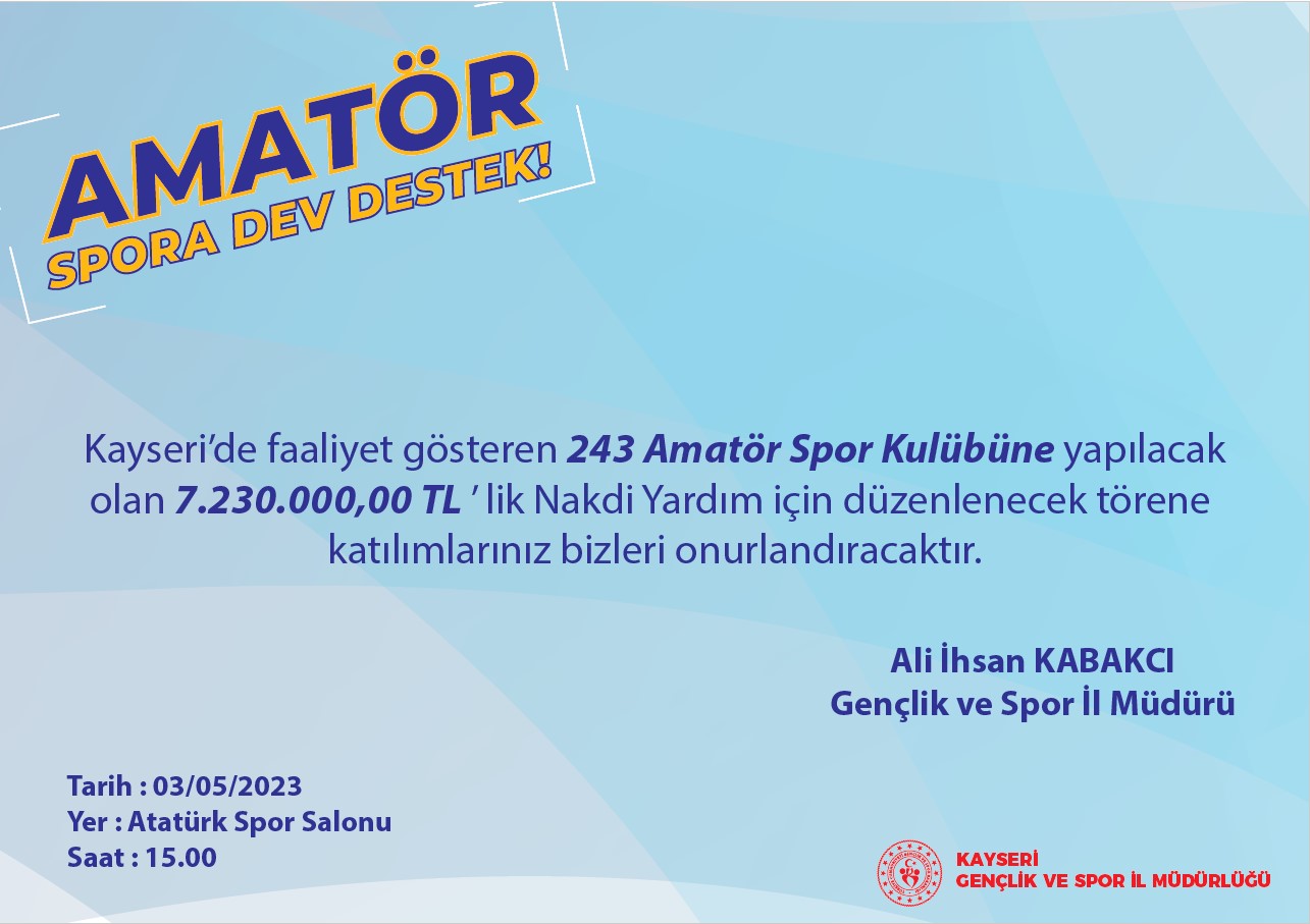 Kabakcı, "Gençlik ve Spor İl Müdürlüğümüz tarafından 03.05.2023 tarihinde saat 15:00'da İl Müdürlüğü Atatürk Spor Salonu'nda Amatör Spor Kulüplerine Nakdi Yardım Töreni düzenlenecektir. Yardımda bulunacağimiz takımlarımızı törenimize bekliyoruz" şeklinde konuştu.