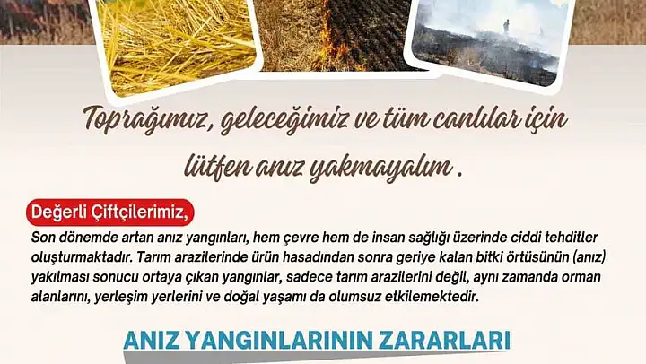 Tarım ve Orman İl Müdürlüğü tarafından yapılan bilgilendirmede; anız yakmanın çevre, insan sağlığı ve ekonomik açıdan ciddi zararlar doğurduğu vurgulandı. Yapılan açıklamada, 'Hasat sonrası tarlalarda kalan anızın yakılması, yalnızca tarım arazilerinde değil, aynı zamanda orman alanlarında, yerleşim yerlerinde ve doğal yaşam üzerinde de büyük tehlikeler oluşturuyor. Yangınların toprağın verimliliğini azaltarak çevreye zarar verdiği, hava kirliliğine yol açtığı ve biyolojik çeşitliliği tehdit ediyor' ifadelerine yer verildi.