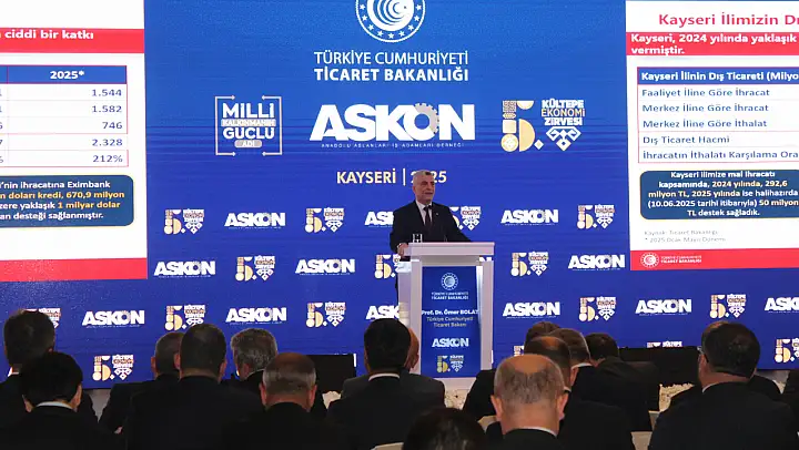 Ticaret Bakanı Prof. Dr. Ömer Bolat; ASKON Kayseri Şube Başkanı olduğu dönemde Ali Özcan tarafından başlayan Kültepe Ekonomi Zirvesi'ne katıldı. Burada konuşan Bakan Bolat; Kayseri'nin ihracatta önemli bir yerde olduğunu kaydederek, 'Kayseri ilimizin ihracatımızda önemli bir yerde olmasından büyük bir memnuniyet duyduğumuzu ifade etmek isterim. Nitekim 2024 yılı itibari ile Kayseri ilimizin faaliyet iline göre ihracatı 3,64 milyar dolar olmuştur. Merkez illerine göre ihracatı ise 3,75 milyar dolar olmuştur. 2024 Ocak-Mayıs döneminde ise ihracatının bir önceki yılın aynı dönemine göre yüzde 3,0 artışla yaklaşık 1,6 milyar dolar olmuştur.