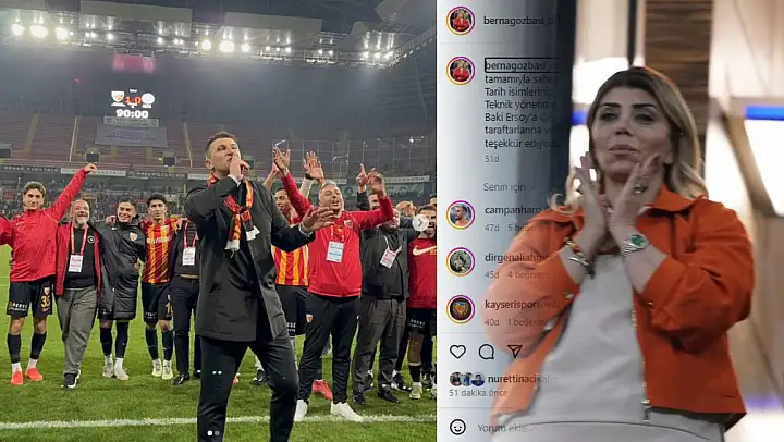 İş insanı Berna Gözbaşı, sosyal medya hesabından teşekkür etti. Gözbaşı, 'Bu büyük lig mücadelesinde yüreklerini tamamıyla sahaya koyan futbolcularımızı kutluyorum. Tarih isimlerinizi tek tek altın harflerle yazacak. Teknik yönetime, Nurettin Başkana, Milletvekilimiz Baki Ersoy'a ve tabii ki Büyük Kayserispor taraftarlarına ve liderleri Ahmet Dirgenali'ye katkıları için sonsuz teşekkür ediyorum' ifadelerini kullandı.