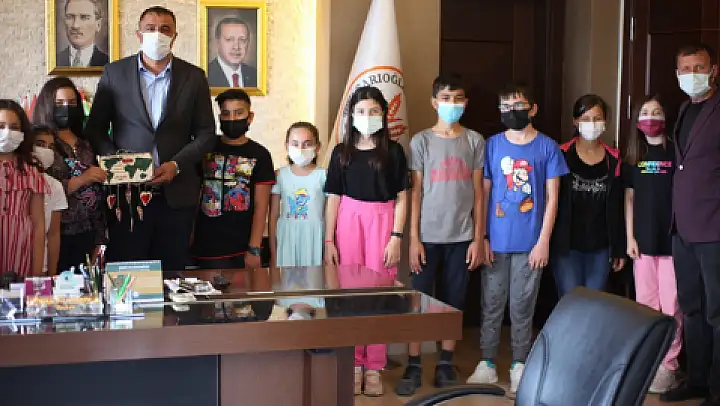 KAYMEK Sarıoğlan Sosyal Yaşam Merkezi'nde yürütülen Mutlu Çocuklar Projesi kapsamında 12 öğrencinin, geri dönüşüm malzemelerinden yaptıkları çalışmayı Sarıoğlan Belediye Başkanı Bekir Ayyıldırım'a hediye etti.