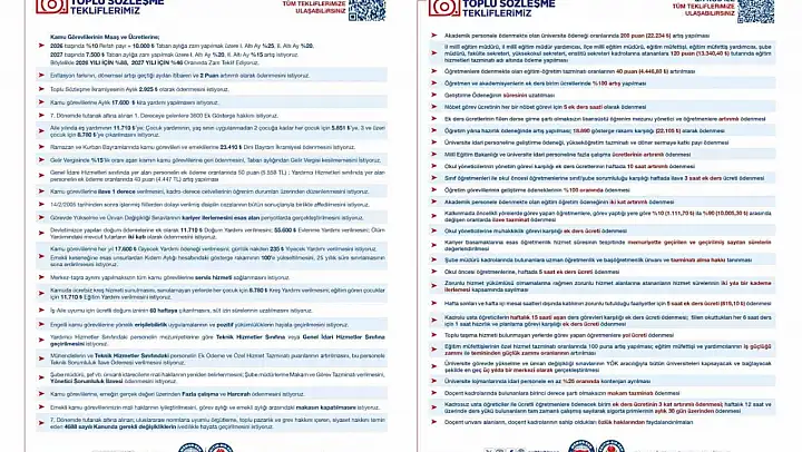 Memur-Sen tarafından 2026-2027 yıllarını kapsayan 8. Dönem Toplu Sözleşme sürecinde kamuoyuyla paylaşılan tekliflerden bazıları ise şu şekilde: