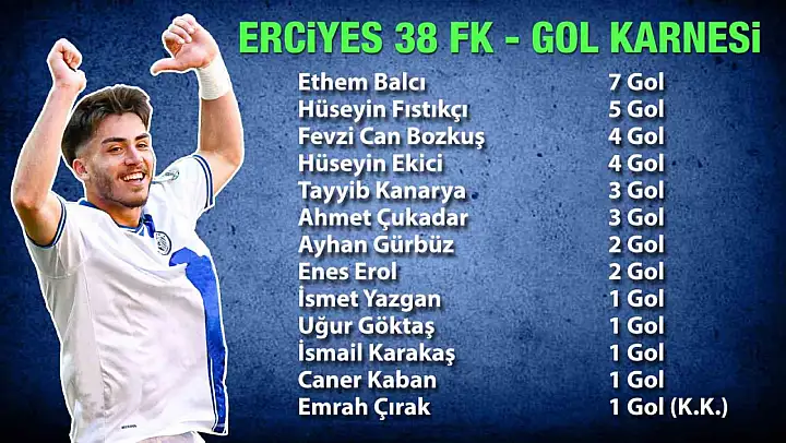 Türkiye 3. Lig 4. Grup'ta mücadele veren ve ligi 34 puanla 9. sırada tamamlayan Erciyes 38 Futbol Kulübü'nde en çok gol atan isim Ethem Balcı oldu. Ethem Balcı, 30 haftalık maratonda 7 gole imza attı. Ligde oynadığı 30 maçta rakip ağlara 35 gol atan mavi-siyahlı takımda, 7 gol atan Ethem'i 5 golle Hüseyin Fıstıkçı takip etti. Erciyes 38 FK'nın lig maçlarında gollerini atan isimler şunlar oldu: