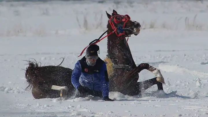 Erzurum'da EİT 2025 Turizm Başkenti etkinlikleri kapsamında düzenlenen ve kar üzerinde gerçekleştirilen at yarışları zaman zaman yürekleri ağızlara getirdi.