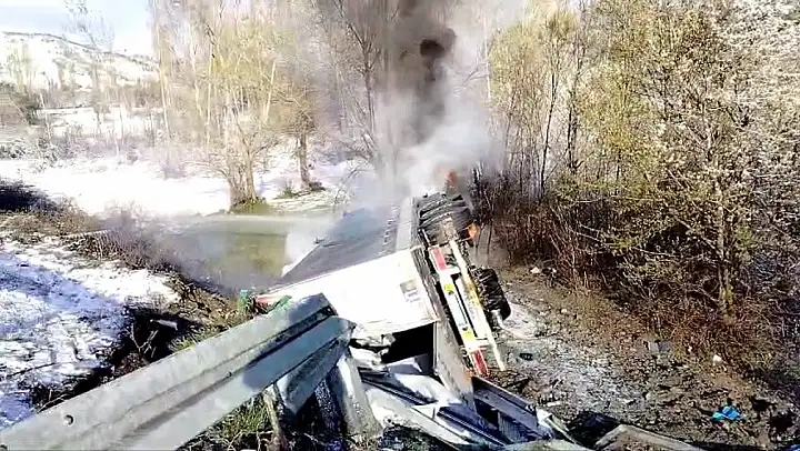 Sivas'ta kontrolden çıkarak yol kenarına devrilen tır, alev aldı. Feci kazada tır sürücüsü hayatını kaybetti.
