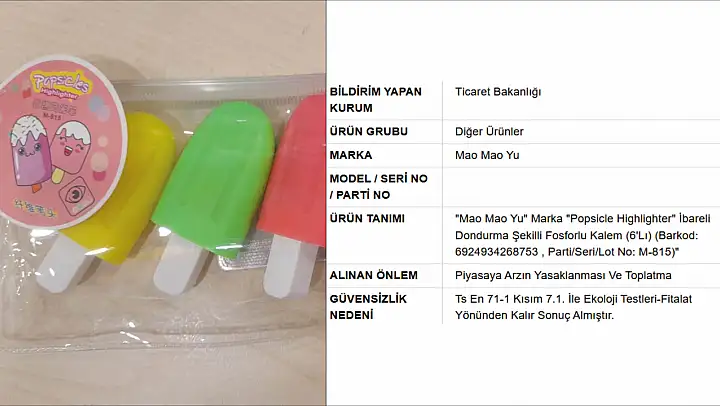 Ticaret Bakanlığı tarafından yapılan son açıklamada, Mao Mao Yu marka 'Popsicle Highlighter' dondurma şekilli fosforlu kalemlerin (Barkod: 6924934268753, Parti/Seri/Lot No: M-815) piyasada dolaşımının yasaklandığı ve toplatıldığı bildirildi.