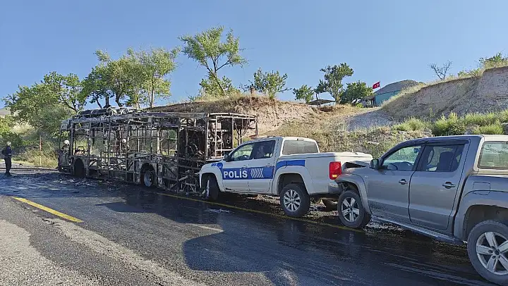 Kayseri'nin Hacılar ilçesinde yanan halk otobüsü küle dönerken, geriye doğru kaçarak arkasındaki 1 polis aracına ve 1 ticari araca da çarptı.