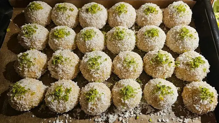 Hamuru için yoğurma kabına oda sıcaklığında bekleyen margarini alalım. Üzerine sıvı yağ, yoğurt, pudra şekeri, kabartma tozunu ekleyerek karıştıralım. Son olarak unu da kademeli bir şekilde ekleyerek hamurumuzu yoğuralım. Hazır olan hamurumuzdan ceviz büyüklüğünde parçalar koparalım, elimizle yuvarlayarak üzerine bastırın. Hamurun ortasına hazırladığımız harçtan yerleştirelim, hamuru kapatalım ve tekrar güzelce yuvarlayalım. Hazırladığımız kurabiyeleri önceden ısıtılan 180 derece fırında alt üst fansız ayarda 20 dakika pişirelim. Fırından çıkan kurabiyeleri ılıyan şerbete batırarak alalım. Daha sonra kurabiyelerin tüm yüzeyini Hindistan cevizine bulayalım. İstediğiniz gibi süsleyebilirsiniz. Afiyet olsun!