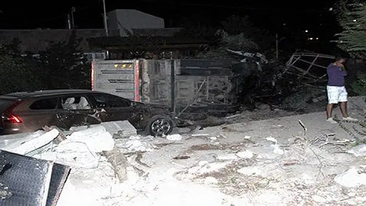 Kayseri'de bir kamyon bahçe duvarını yıkarak park halindeki bir araca çarpıp yan yattı.