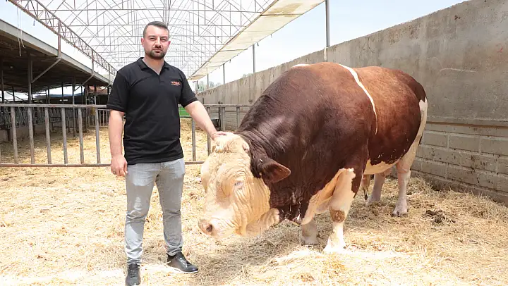 Simmental ırkının özelliklerine değinen Asıl, 'Simmental kombine bir ırktır. Hem etçi hem sütçü bir ırktır. Erkek hayvanlarında ortalama yüzde 68 oranında randımanı olan günde 1350 ve 1650 gram arasında et alan bir ırktır. Burada diğer ırklarla kıyasladığımız zaman hem randımanda hem süt verimliliğinde Simmental ırkının farkını çok rahat bir şekilde görebiliriz. Simmental ırkının ülkemiz hayvancılığına daha çok katkıda bulunacağına inanıyoruz. Bu şekilde çalışmalarımız devam etmektedir. Poyraz'ı şu anda satılığa çıkardık. Bu boğamız en son 500 bin TL'yi gördü. 550 bin TL istedik. O şekilde pazarlığımız yarıda kaldı. Yeni alıcılarını, yeni taliplerini inşallah bekliyoruz. 4 yaşında, yaklaşık 1,5 ton ağırlığın üzerinde. Yaklaşık 1 ton civarında et çıkmasını bekliyoruz' diye konuştu.
