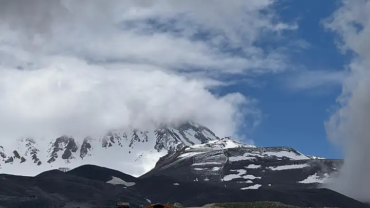 Kayseri'de sıcaklıkların düşmesi ile birlikte Türkiye'nin önemli kış turizmi merkezlerinden biri olan Erciyes Dağı'nın tepesini bulutlar kapladı. Yaz aylarına girerken de eteklerinde hala kar olan Erciyes Dağı tepesindeki bulutlarla birlikte kartpostallık görüntüler oluştururken görenlere de görsel şölen yaşattı.