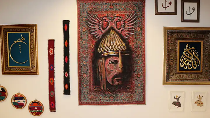 Kayseri'de Elif Sevde Karaoğlan (27), Seramik Kadın Kooperatifi Başkanı annesinin açtığı sergi için eski dokuma ve baskı halıların üzerine Sultan Alparslan, Kanuni Sultan Süleyman gibi devlet büyükleri ile hayvan figürleri resmetti. 3 ayda 8 resim yapan Karaoğlan, 'İlk başlarda eski yün halılardan başladık. Onların üzerine resim yaptım. Ondan sonra baskı halılara akrilik boyayla fırça tekniğiyle bu eserleri ortaya çıkardık' dedi.
