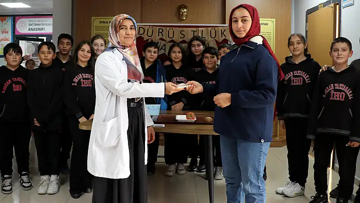 Din Kültürü ve Ahlak Bilgisi Öğretmeni Nuray Doğan ise 'Öğrencilerimizle çeşitli projeler yapıyoruz. Değerler Eğitimi kulübünde 'ÇEDES' diye bir projemiz var. Bu proje kapsamında da 'dürüstlük' kavramını öğretmek için çocuklarla bir etkinlik yaptık. Bu etkinliğimizde çocuklar kendi alışverişlerini kendileri yapıyorlar. Para üstü varsa kendisi alıyor, istediği meyveyi seçiyor. Hiç kimse başında beklemiyor. Satıcısı olmayan bir manav. Sonra çocuklarla konuştuk 'Buradan elde edilen geliri ne yapabiliriz?' diye. Esma isminde bir öğrencimiz SMA'lı çocuklara bağışlayabileceğimizi söyledi. Bölgemizde de Muhammed Yusuf isimli bir çocuğumuz SMA hastası olduğu için ona bağışlamak istedik' diye konuştu.