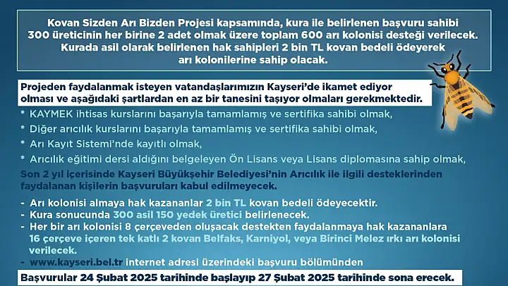 Başvuruya ve projeye ilişkin detaylı bilgiye, Kayseri Büyükşehir Belediyesi resmi web sitesinde yer alan https://www.kayseri.bel.tr/haberler/duyuru-kovan-sizden-ari-bizden-projesi23778 adresli linkten erişilebilecek.