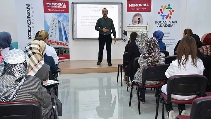 Kocasinanlı hanımlara yönelik bu seferde doğru nefes alma tekniklerini ve diyaframın kullanılmasını da içeren ‘Sesin Doğru Kullanımı ve Ses Terapisi' başlıklı seminer verildi. Seminere yoğun ilgi gösteren hanımlar, doğru nefes alma tekniklerini öğrenip uyguladı.