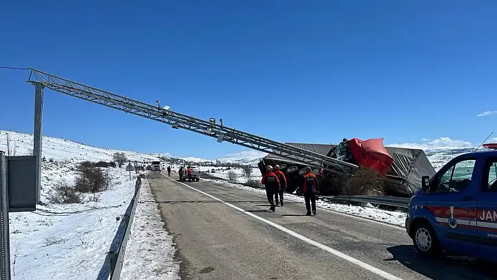 Sivas'ta kontrolden çıkan tır, Elektronik Denetleme Direğine çarpıp bariyerlerde asılı kaldı. Tırda sıkışan sürücü AFAD ekipleri tarafından kurtarıldı.
