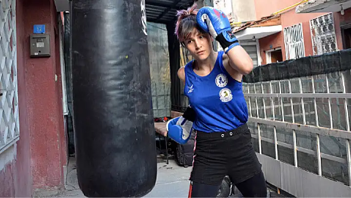 Kayseri'de yaşayan muaythai milli sporcusu Gülistan Turan (23), koronavirüs salgını nedeniyle oturduğu tek katlı binanın girişini spor salonuna çevirdi.