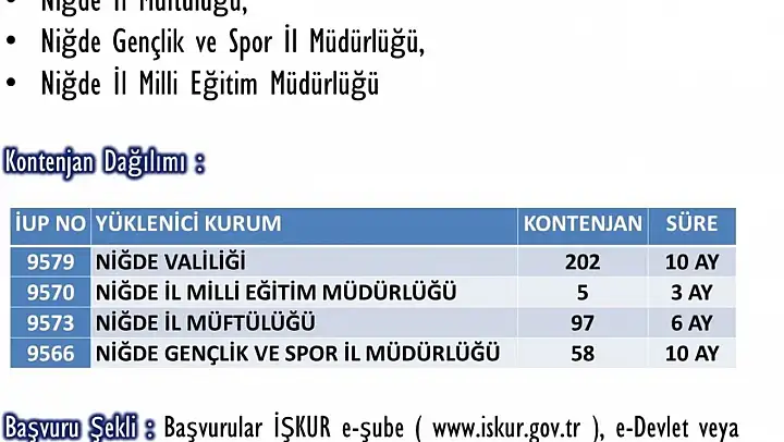 İŞKUR İl Müdürlüğü, Niğde Valiliği, İl Müftülüğü, Gençlik ve Spor İl Müdürlüğü ile İl Milli Eğitim Müdürlüğü bünyesinde toplam 362 kişilik kontenjan açıldığını duyurdu.