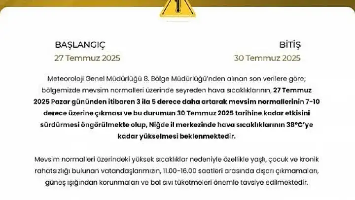 Bölgede halihazırda mevsim normallerinin üzerinde seyreden sıcaklıkların 3 ila 5 derece daha artması ve mevsim normallerinin 7-10 derece üzerine çıkması öngörülüyor. Bu sıcak hava dalgasının 30 Temmuz 2025 tarihine kadar etkisini sürdüreceği, Niğde il merkezinde ise sıcaklıkların 38C'ye kadar yükselebileceği tahmin ediliyor. Niğde Valiliği tarafından yapılan açıklamada, özellikle yaşlılar, çocuklar ve kronik hastalığı bulunan vatandaşların 11.00-16.00 saatleri arasında güneş ışınlarına doğrudan maruz kalmaktan kaçınmaları gerektiği ifade edildi.