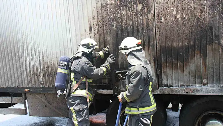 Antalya'nın Serik ilçesinde park halindeyken çıkan yangında kapalı kasa bir kamyon alev alev yandı. Sürücüsünün son anda fark ettiği yangın, itfaiyenin müdahalesiyle söndürüldü.