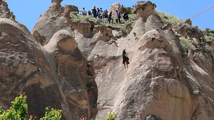 Nevşehir'de peri bacalarının üzerine güvenli iniş yapan sıcak hava balonunun sepetinden inerek bölgede mahsur kalan turistleri kurtarmak için çalışma başlatıldı.