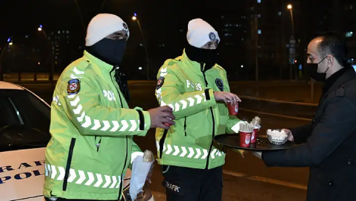 Kayseri Büyükşehir Belediyesi ekipleri, kısıtlama gününde eksi 5 derecede görev yapan emniyet mensubu polislere, bekçilere ve zabıta ekiplerine sıcak çay ve sandviç ekmeği ikram etti.
