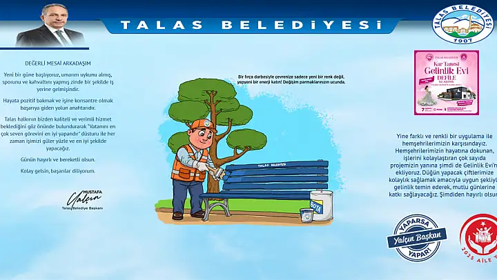 Başkan Yalçın'ın imzasını taşıyan bugünkü mesajda şu ifadeler yer aldı: 'Yeni bir güne başlıyoruz, umarım uykunu almış, sporunu ve kahvaltını yapmış zinde bir şekilde iş yerine gelmişsindir. Hayata pozitif bakmak ve işine konsantre olmak başarıya giden yolun anahtarıdır. Talas halkının bizden kaliteli ve verimli hizmet beklediğini biliyor, işimizi güler yüzle ve en iyi şekilde yapacağız.'