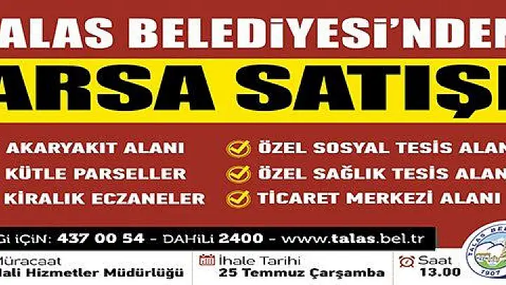 Talas Belediyesi 2886 sayılı Devlet İhale Kanununa göre kiralık eczaneler ve satılık akaryakıt alanı, kütle parseller, özel sosyal tesis, özel sağlık tesisi, ticaret merkezi alanı olmak üzere toplam 21 taşınmazı ihale edecek. Konuyla ilgili ihale 25 Temmuz Çarşamba günü saat 13.00'te Belediye Meclis Salonu'nda yapılacak.