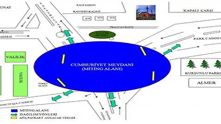 3. toplanma alanı: Cumhuriyet Meydanı. Bu alan sadece seçim dönemlerinde ve Valilik Makamı tarafından uygun görülen etkinliklerde kullanılmak üzere belirlenmiştir. Pankart asılacak yerler: Cumhuriyet Meydanında bulunan karşılıklı elektrik direkleri arası, afiş yapıştırılacak yerler: uygun görülen reklam panoları.” HABER-FOTO: İHA