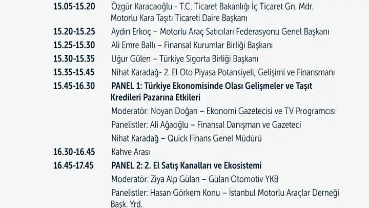 Açılış konuşmaları Ticaret Bakanlığı İç Ticaret Genel Müdürlüğü Motorlu Kara Taşıtı Ticareti Dairesi Başkanı Özgür Karacaoğlu, Motorlu Araç Satıcıları Federasyonu (MASFED) Genel Başkanı Aydın Erkoç, Finansal Kurumlar Birliği (FKB) Başkanı Ali Emre Ballı ve Türkiye Sigorta Birliği (TSB) Başkanı Uğur Gülen tarafından yapılacak Zirve'de gerçekleştirilecek panellerde ise; 2. el oto ve finans sektörünün önden gelen ve yön veren temsilcileri, başarı hikayesi olan girişimcileri ile İstanbul Motorlu Araç Satıcıları Derneği temsilcileri, ekonomi, finans ve sigorta uzmanlarınca sektörün derinliğine analizleri yapılacak.