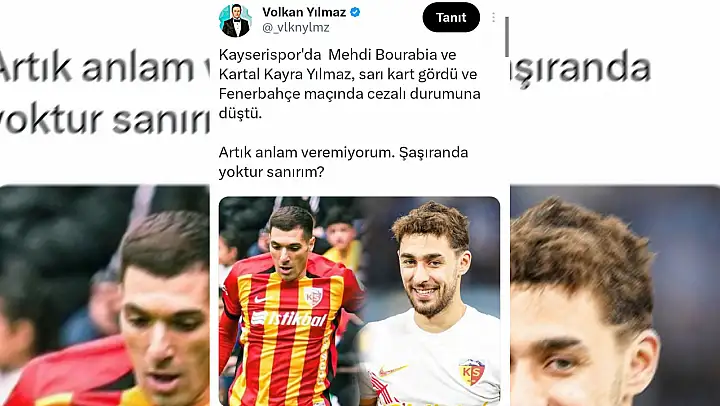 Galatasaray'a yakınlığı ile bilinen gazeteci Volkan Yılmaz, Kayserispor'da cezalı duruma düşen futbolcular üzerinden yorum yaptı. Yılmaz, sosyal medya hesabından, Kayserispor'da cezalı duruma düşen ve Fenerbahçe maçında oynayamayacak oyuncuları belirterek, 'Kayserispor'da Mehdi Bourabia ve Kartal Kayra Yılmaz, sarı kart gördü ve Fenerbahçe maçında cezalı duruma düştü. Artık anlam veremiyorum. Şaşıran da yoktur sanırım' diye paylaşım yaptı.