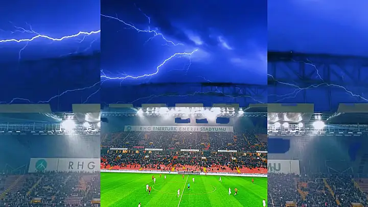 Yaklaşık 25 bin taraftarın bir araya gelip takımlarını desteklediği RHG Enertürk Enerji Stadyumu'nda bazı taraftarlar, şimşeklerin gökyüzünü aydınlattığı anları cep telefonlarından görüntüledi.