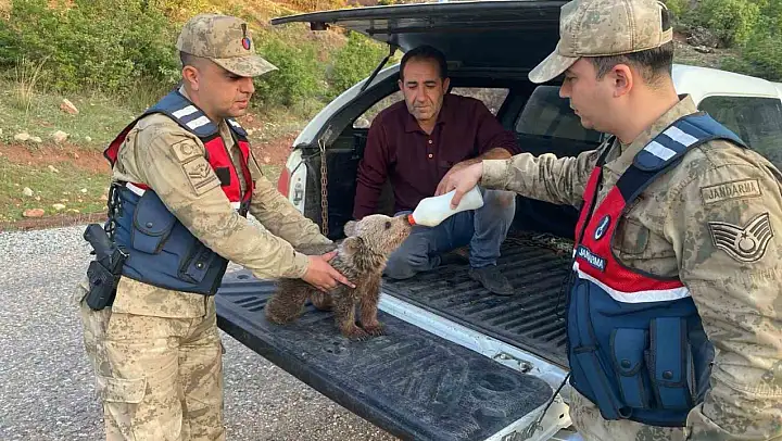 Siirt'te Jandarma tarafından bulunan yaralı Şahin koruma altına alınırken yavru ayıya süt verilip doğaya bırakıldı.
