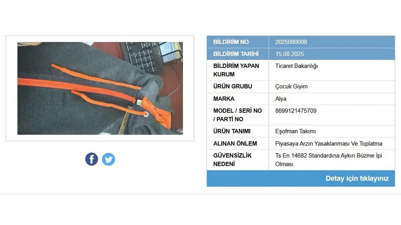 Bakanlık tarafından yayınlanan raporda Alya marka eşofman takımının piyasaya arzının yasaklanmasına ve bulunduğu yerlerden geri toplatılmasına karar verildi. Antrasit renk eşofman takımı olarak belirtilen ürün yaralanma riski barındırdığı için geri toplatılıyor. Güvensizlik nedeni olarak ise Ts En 14682 standardına aykırı büzme ipi olması gösterildi.
