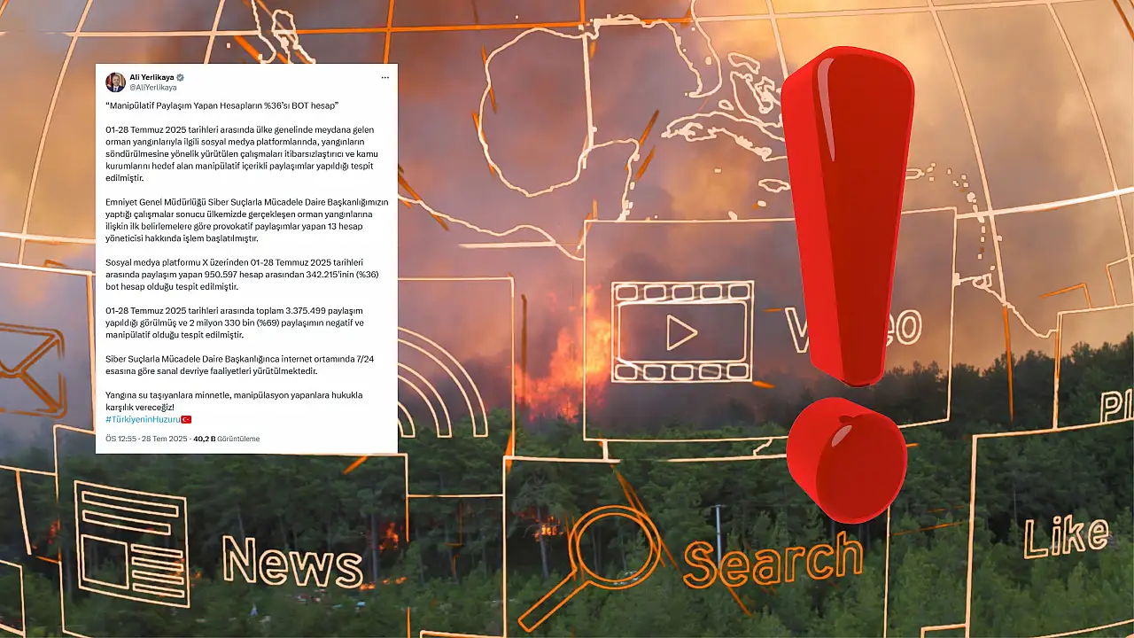 Bakan Yerlikaya: ‘’01-28 Temmuz 2025 tarihleri arasında toplam 3.375.499 paylaşım yapıldığı görülmüş ve 2 milyon 330 bin (%69) paylaşımın negatif ve manipülatif olduğu tespit edilmiştir. Siber Suçlarla Mücadele Daire Başkanlığınca internet ortamında 7/24 esasına göre sanal devriye faaliyetleri yürütülmektedir'' diyerek ‘’Yangına su taşıyanlara minnetle, manipülasyon yapanlara hukukla karşılık vereceğiz!'' ifadelerini kullandı.